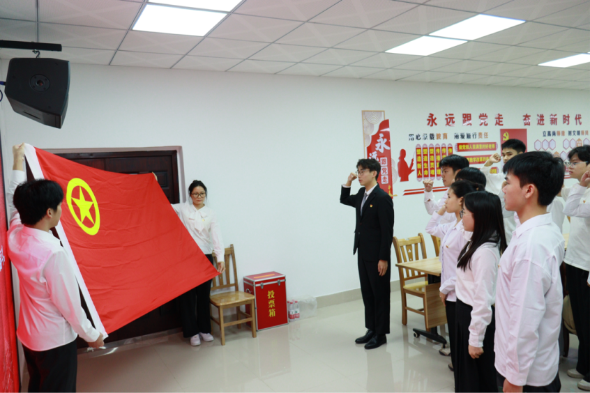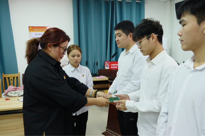 学院团委书记翁斌老师为新团员们颁发团员徽章和团员证。金色的团员徽章在新团员们的胸前闪耀,象征着责任与使命的传承。在庄严的氛围中,学院团委学生副书记陈新予同学带领新团员们向团旗庄严宣誓。