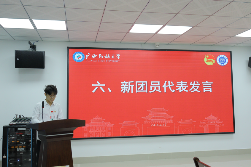新团员代表黄港华同学上台发言,他分享了自己加入共青团的心情与感受,并号召全体新团员未来以高标准要求自己,努力学习,积极奉献,在实践中增长才干,不负青春韶华。