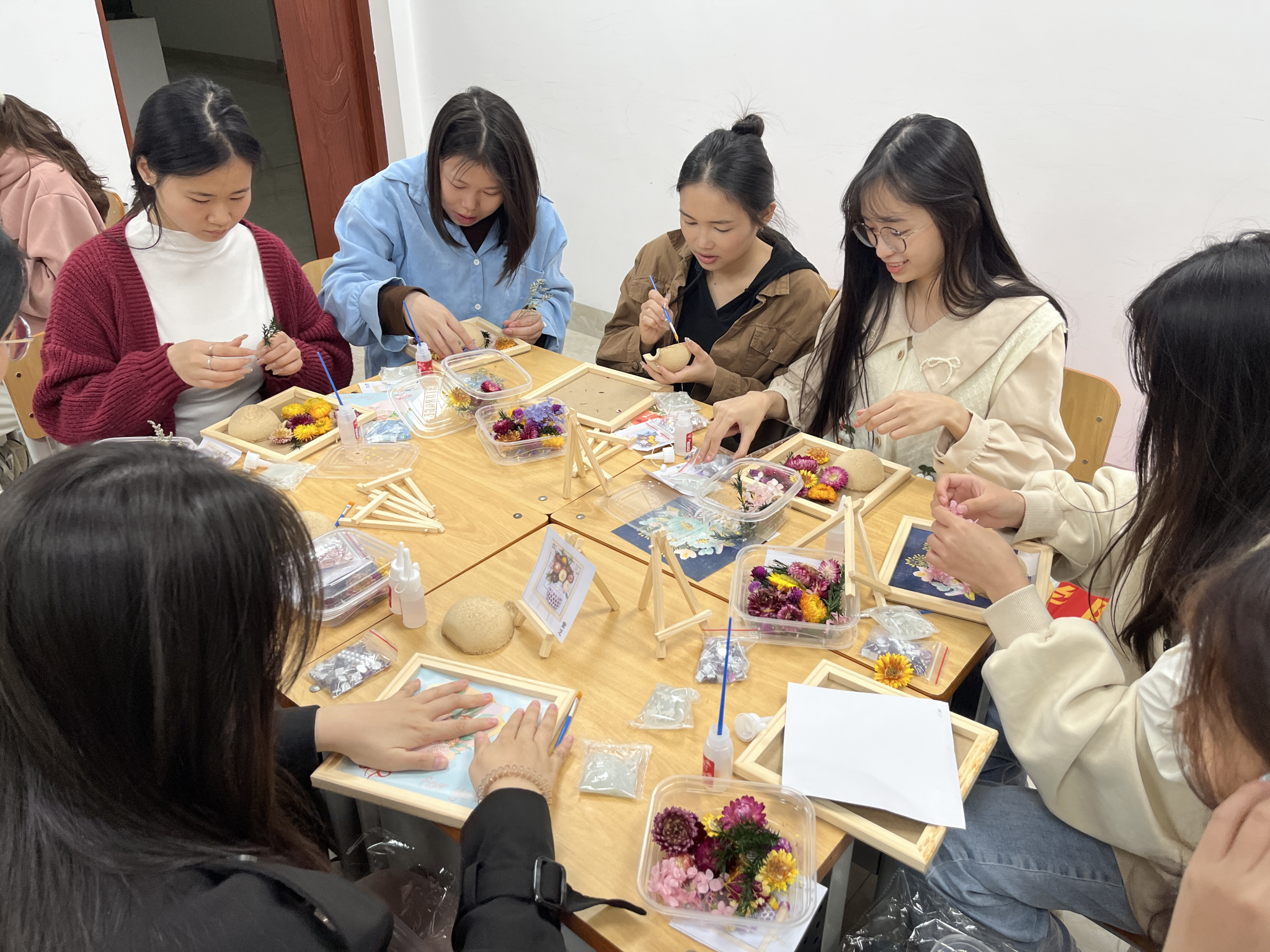 活动在专职辅导员尹彦忠老师的指导下开展。同学们充分发挥自己的创造力和想象力,利用彩色的玻璃方块、陶瓷瓶、干花等材料,来设计属于自己的立体花瓶画。
