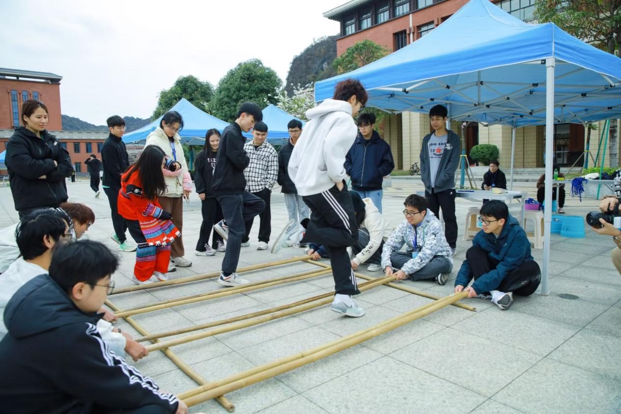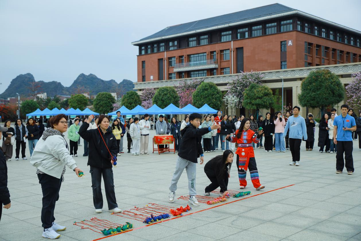 本次民族传统体育竞赛涵盖板鞋接力钓粽、蚂拐捉害虫、背篓绣球、大象拔河、踢大花毽五个特色项目,配套的民族游园活动则设置了非遗制作体验区、传统手工艺坊、民族风情展演区、互动游戏区等八大主题区域。活动现场喝彩不断,同学们在沉浸式体验中尽享传统民俗文化的独特魅力。