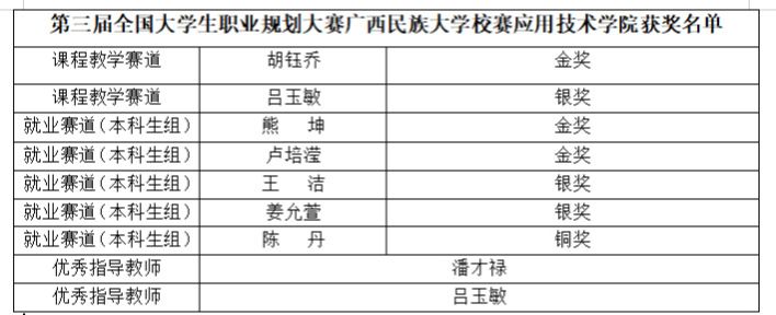 近日,第三届全国大学生职业规划大赛广西民族大学校赛落幕,bw必威西汉姆联共获金奖3项、银奖3项、铜奖1项,2名教师荣获优秀指导教师奖,学院获优秀组织奖。