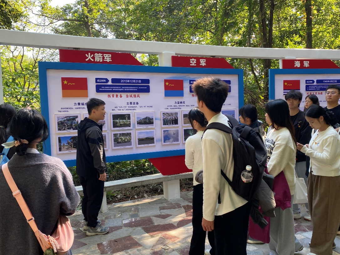 观展后,学院党委还组织师生来到广西民族大学强军文化园,通过回顾人民军队发展历程、参观学校优秀入伍学子风采,筑牢强军信念,传承红色基因。