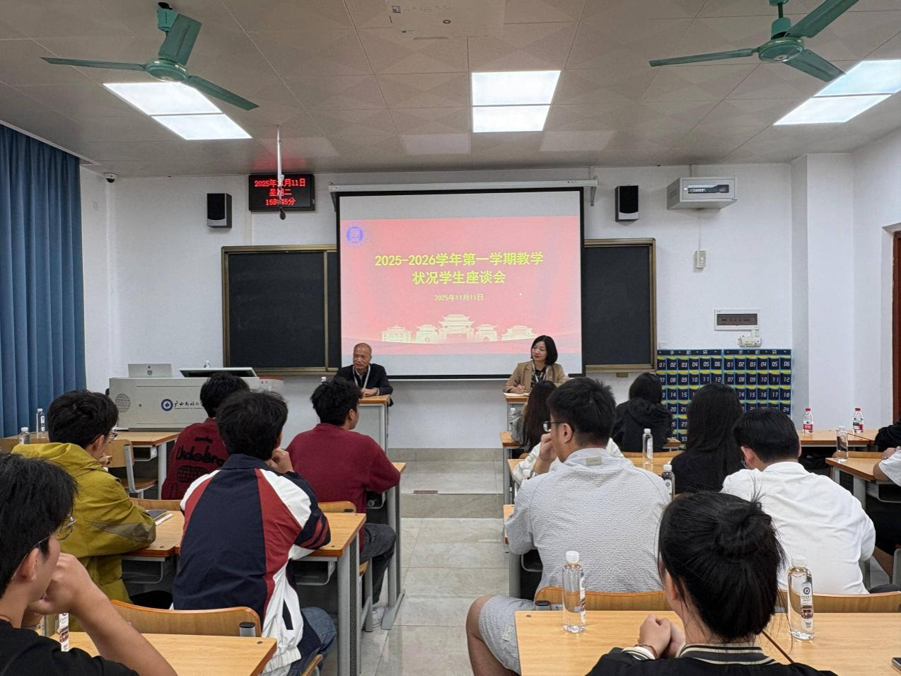 2025年11月11日下午,学校教学督导在武鸣校区一号公共教学楼A402教室组织开展教学工作座谈会。会议由校级督导尹叶青主持,校级督导樊天宝老师、学院教学秘书肖锦燕老师及各班级学生代表参加。